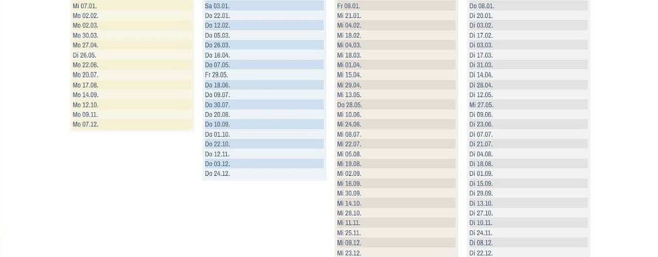 Der Abfallkalender kann hier im Detail eingesehen werden, inkl. Abholtermine in Friedensau: https://www.ajl-mbh.de/abfallkalender/entsorgungstermine